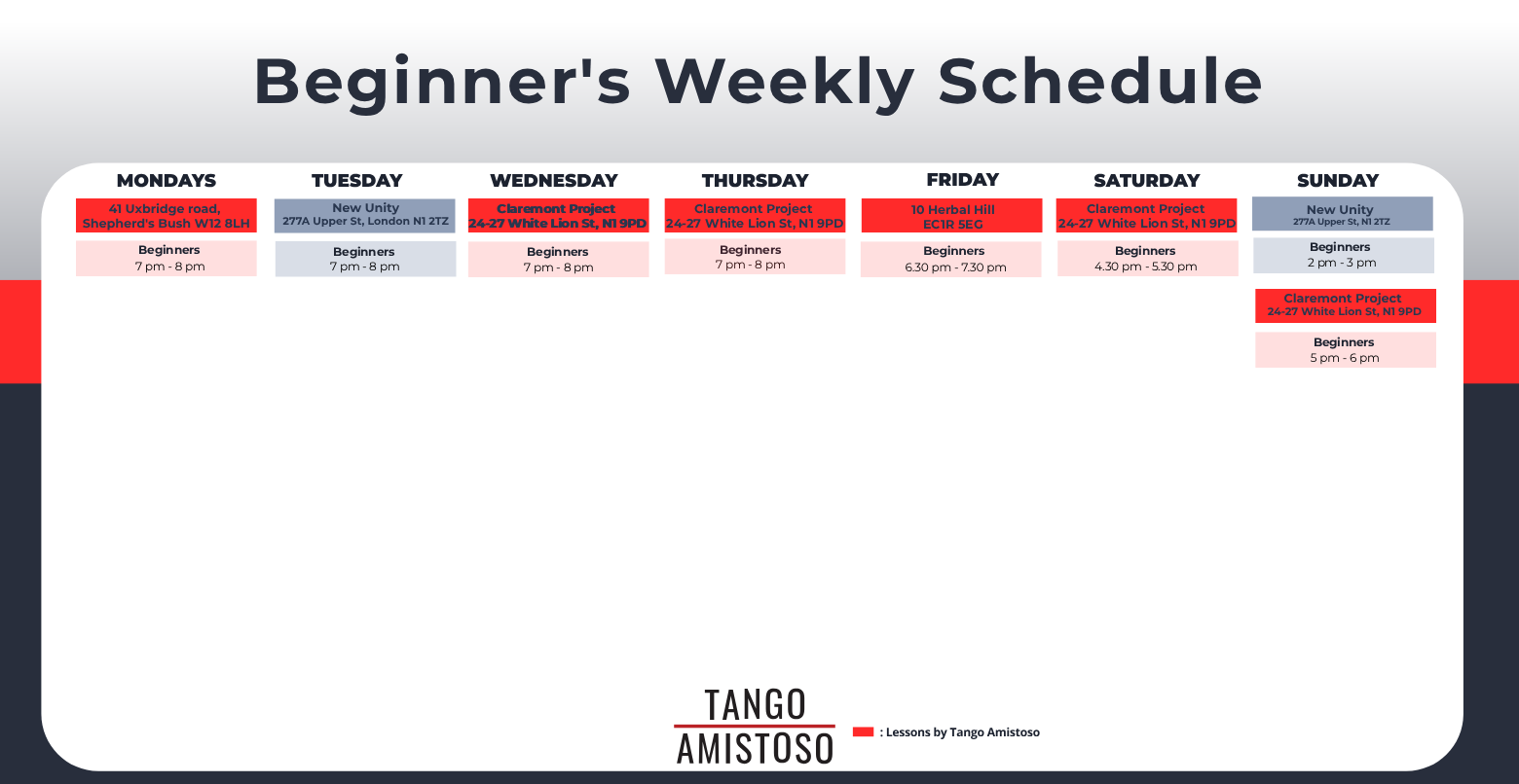 | Tango Beginners Class, Sundays 5pm, Angel | Beginners | 05-Apr-2026 | Sunday | 17:00 - 18:00 | Angel/Islington Lower Hall Claremont Project, 24-27 White Lion St. Islington, London N1 9PD |