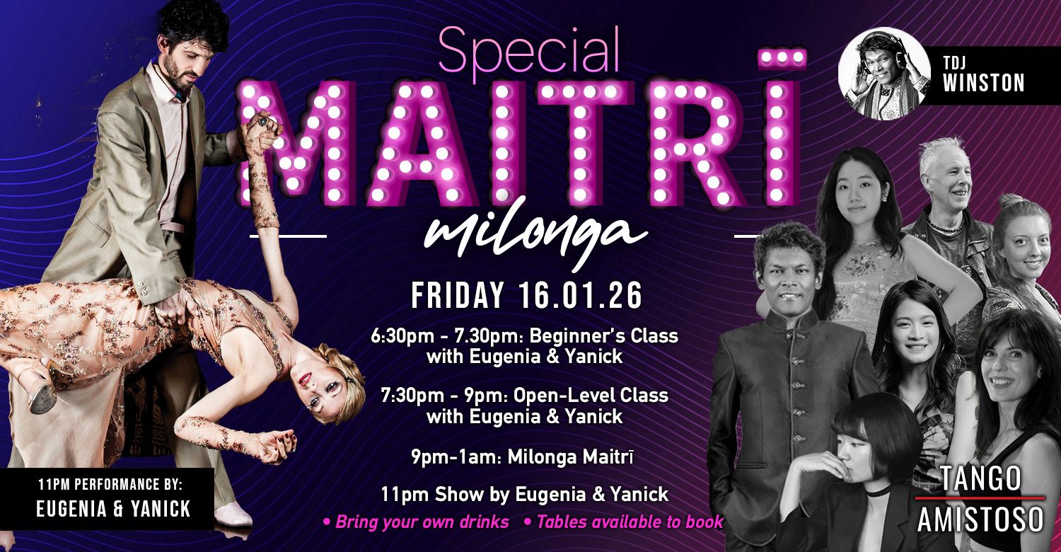 Milonga Maitrī is a vibrant Friday milonga hosted by Tango Amistoso at our Herbal Hill location. “Maitrī” means loving-kindness—a spirit that runs through every tanda and conversation here. Expect uplifting music, great energy, and a friendly crowd ready to dance the week away