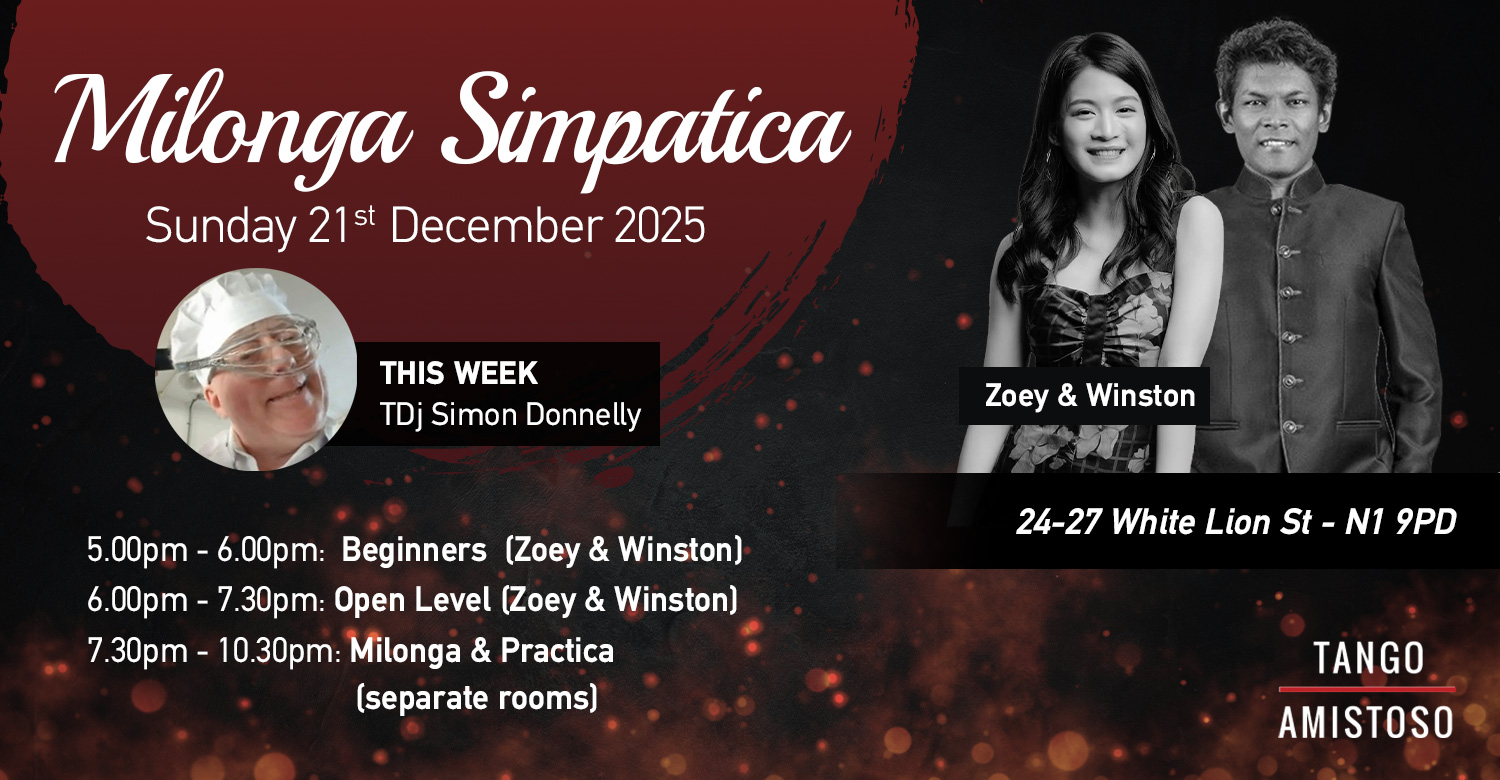Milonga Simpatica is a friendly Milonga run by Tango Amistoso in London every Sunday. The Milonga is run with a real community spirit where we, as a community, work hard to create a warm, friendly and welcoming environment.