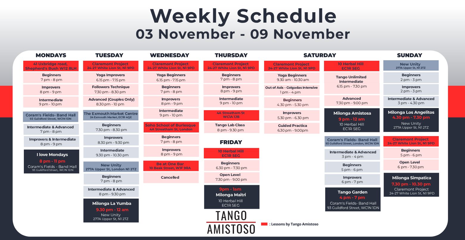 | Tango Open Level Class 7-Week Course, Fridays 7.30pm, Herbal Hill | Open Level | 07-Nov-2025 - 19-Dec-2025 | Friday | 19:30 - 21:00 | 10 Herbal Hill EC1R 5EG |